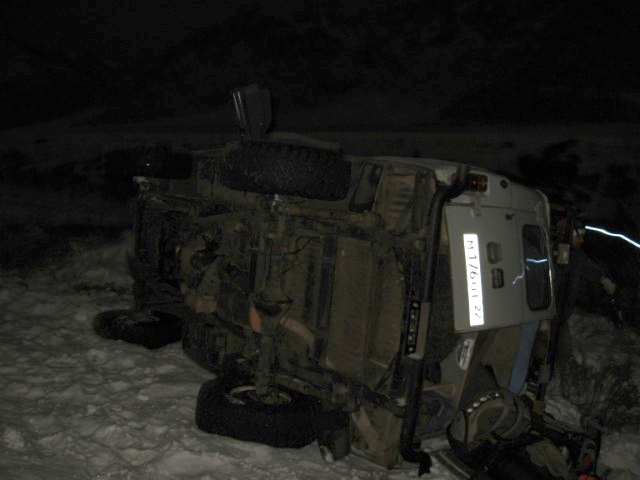Но недолго романтика длилась: на очередном прижиме Вова закусился с плетущимися легковушками и в итоге, пока их обгоняли, положили Кузю на бок. Обгоняемый балбес резко взял влево в повороте, так что выбор был невелик: либо в бочину, либо в сугроб. Сугроб выглядел привлекательнее, да и совсем нестрашно, для Кузи на его-то лаптях)) Но.... Уазик зарезало в сугробе, стянуло в сторону, он зацепился левым колесом за щель в бетонном ограждении, замялся диск, зажевало и порвало покрышку - как результат разворот и плавное приземление на жесткие камни. Все, конечно, остались живы-здоровы, вылезли, раскидали по-быстрому машину и стали ждать помощь: самим было поставить его на колеса нереально.