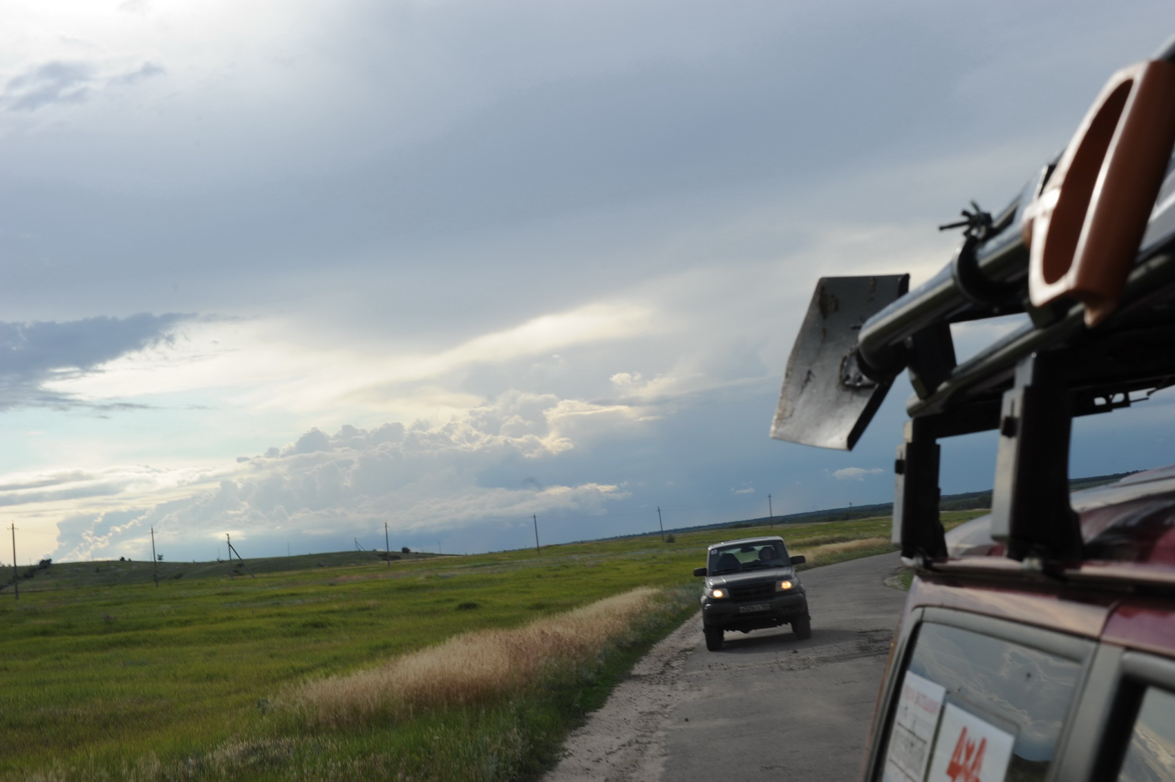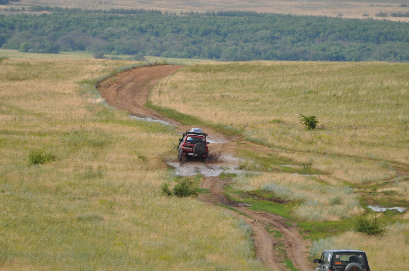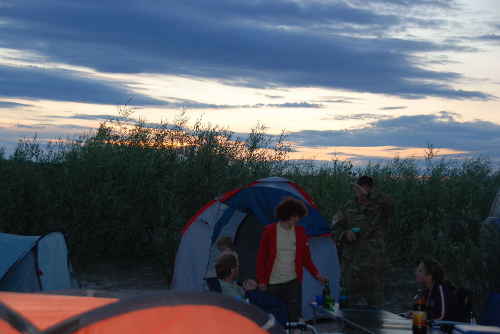 23.06.11 «Ура!!! Каникулы!!!» Днёвка…как много в этом слове… Замечательное, скажу я вам, утро получается, если начинать его с блинов…А если после нескольких дней путешествий по полям и холмам есть возможность остановиться у реки с пляжами из белого песка, никуда не спешить – просто счастье! Запасы овощей подходили к концу, да и хлеба не стало. За всем этим 2-мя машинами отправились на рынок, совсем забыв, что это день рабочий, а времени уже за полдень…На рынке всего несколько продавцов, а товаров не навалено кучей как в Москве – выбор невелик. С другой стороны, отсутствие выбора бывает полезным – не мучаешься, а берёшь, что есть. Повезло нам всё-таки…всё, что нужно, было: молодая картошечка, ароматные большие розовые помидоры, огурчики с грядки, зелень, молодой чесночок и даже черешня не из Турции! А уж как порадовала палатка с выпечкой, куда только что приехал с пекарни хлеб! При виде свежих булочек и пирожков, как удержаться от покупки…набрала два пакета… С корабля на бал – с рынка на дюнную гонку! Старались не опоздать к началу, а оказались первыми…Да настолько рано приехали на место проведения, что организаторы не успели поставить вешки обозначения трассы…Зато хватило времени на то, чтобы пройтись по маршруту и найти места для фотосессии. «Песок сыроват…Вот если бы он был сухой, вот тогда было бы весело…» - сокрушались организаторы, привязывая полосатую ленту к вешке. Ничего-ничего…Кто ищет приключений, тому любое место подойдёт! Необходимо было пройти 3 круга: 1 – пробный и 2 - на время. Эффектных поворотов трасс, почти, не было, а вот спусков, на которых захватывает дух, хватило и 3-х. Первым прокатился Дмитрий Кузнецов, затем Александр Будилов. Тем временем, я короткими перебежками с холма на холм, старалась поймать интересный кадр. Надо сказать, что сухая трава при ходьбе царапает кожу, а при беге по ней раздирает ноги до крови…мало приятного, но это всё потом, а когда чем-то увлечен, не замечаешь препятствий. На Патриоте не рискнула участвовать в гонке, потому «работала» фотокорреспондентом. Желание прокатиться по трассе перевесило, и я напросилась к Будилову Александру в пассажиры со словами: «Покатай меня, большая черепаха…»… пару кругов вне зачёта. Организаторы любезно разрешили покататься. Счастью не было границ!!! Улыбка не сходила с лица! Один резкий поворот и во рту песок! Забыла, что окно приоткрыто, а на очередном вираже колёса копнули песка…Перед финишем была чудесная горочка! Сначала в лобовое стекло видно небо, а потом машина мордой вниз и резкий поворот…Здорово! Однако, пройдя 3 круга заметили, что камера в машине не включена…!!! Причём к этому времени трасса была прилично размешена, а, следовательно, ещё 3 круга стали веселее прежних!!! Как выяснилось потом, Будилов Александр стал победителем дюнной гонки! Приз – набор шаклов! Во время покатушек ни один продукт не пострадал…пакеты с овощами покоились в сторонке на песочке, пока машины преодолевали горки. В лагере все ждали нашего возвращения, чтобы вкусно пообедать. К нашему приезду всё было готово! Даже тент от солнца натянут над столами. А тут мы с ароматными помидорами… Небо стало хмуриться…В такую погоду, особенно, после обеда, полагается поспать. Несколько участников команды расползлись по своим палаткам. Наученная горьким опытом, свою палатку накрыла дополнит