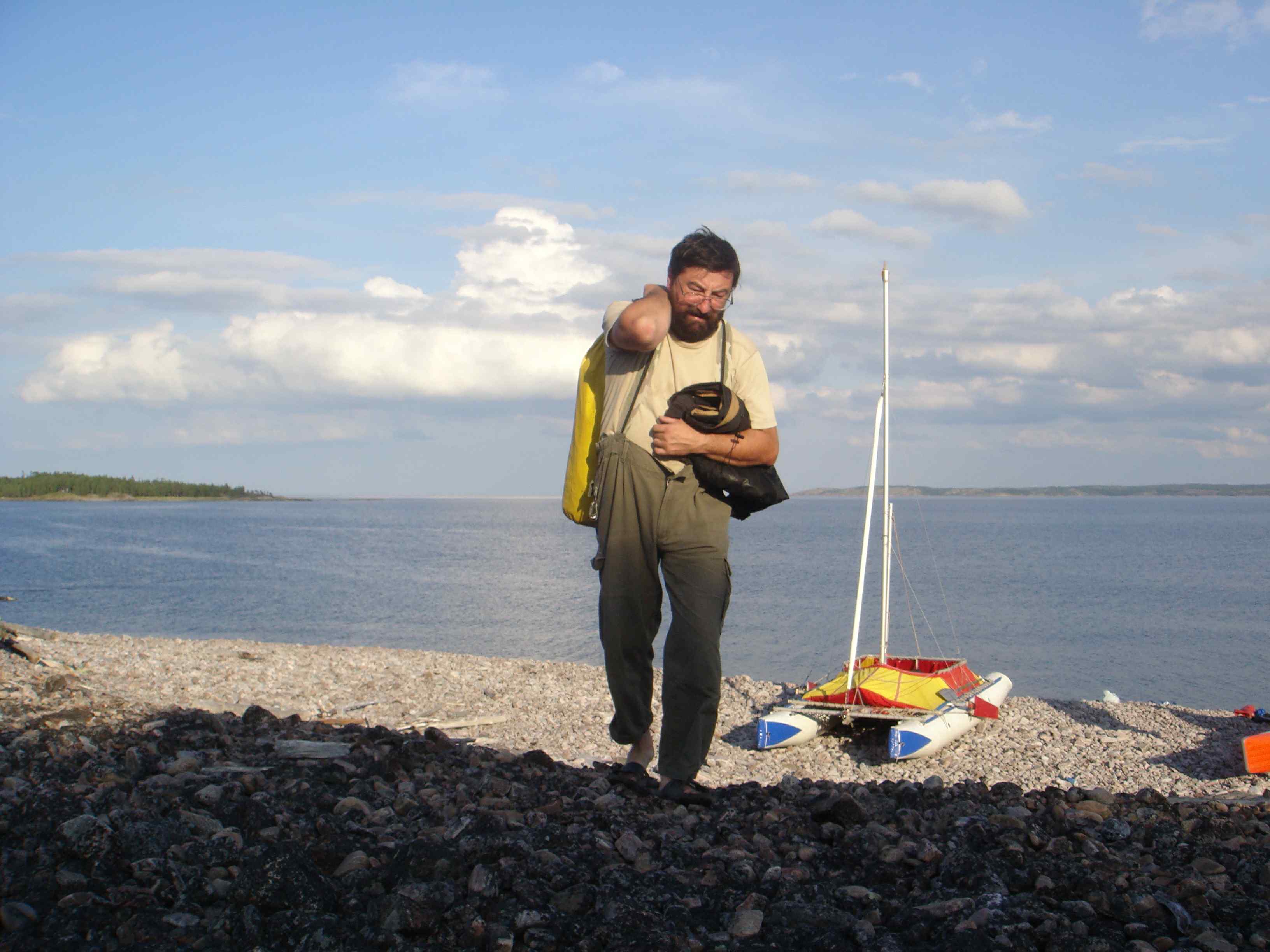 Стапель процесс нудный от 2 и выше часов. Все зависит от навороченности катамарана. Изначально катамаран Альбатрос, предназначенный для несложных походов в удалении от берега не более чем 1 км, собирался от силы час двумя чел. Сейчас это не меньше двух. От старой конструкции осталось пожалуй рама все остальное новое. Вообще это действительно шедевр завода ТАПОИЧ в Казахстане. Кому интересно может расшифровать сокращение. Т е могу смело его относить к категории "прото". Остальные два - категория туризм. Надо сказать, что на Белом я уже второй раз на воде. В обойх случаях я всегда попадал на курорт. А курорт чем отличается? Правильно! Температура воды равна температуре воздуха. Опятьже в обоих случаях мне повезло. Когда мы в конце прошлого маршрута вышли после 320 км по воде на берег в Соловках, то первое что попалось на глаза это доска на метеостанции где мелом было выведено 10 вода 10 воздуха. Ну, кто скажет что мы не на курорте?! В \тот раз Белое не подкачало. 22 вода 25 воздуха! И так 10 дней! Ну при 10 мы купались, а тут просто укупались. Я еще на дону лез везде где была вода, а тут.............