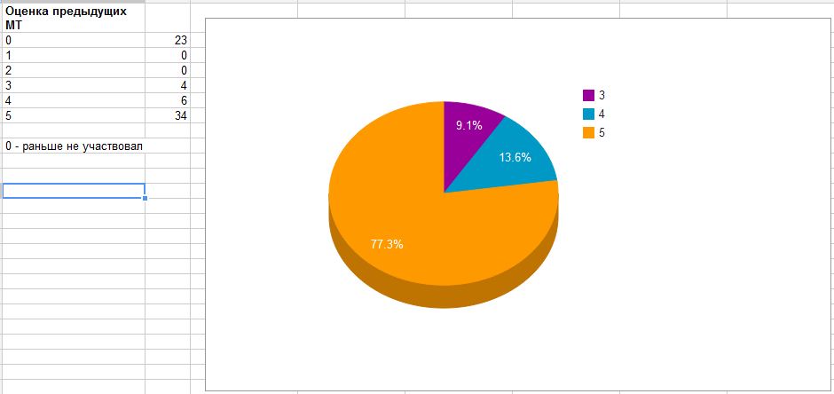 Отбрасывая нулевые оценки новичков, означающие "я еще не был на мероприятии", получаем, что более трех четвертей ранее участвовавших оценили прошедшие МТ на отлично. Это очень приятно, даже делая поправку на простые человеческие доброжелательность и корректность в высказываниях. Однако организаторам нужно больше обращать внимание на тех, кто сказал, не смотря ни на что, правду, поставив тройку и четверки - есть над чем работать! Отсутствие полностью негативных оценок понятно и закономерно - тот, кому не понравилось, просто не приезжает на МТ второй раз.