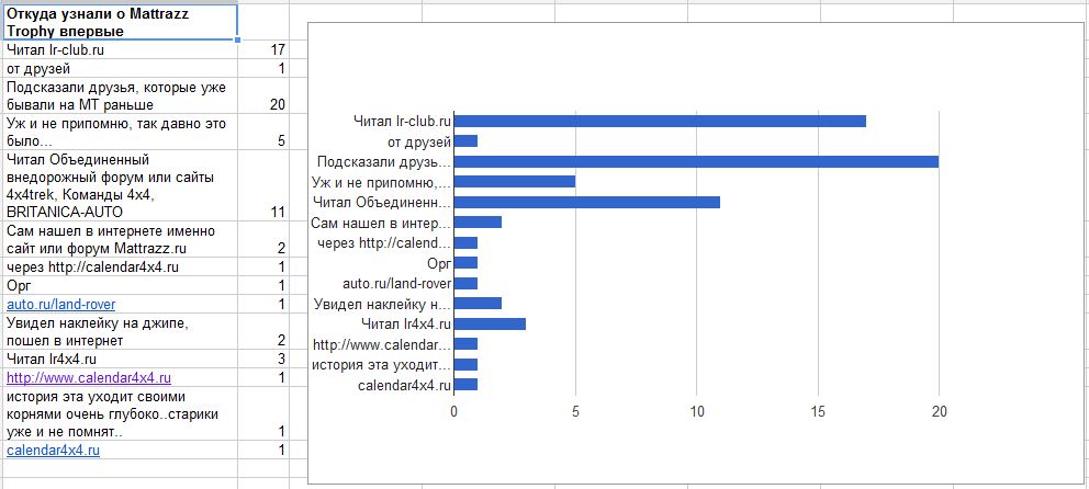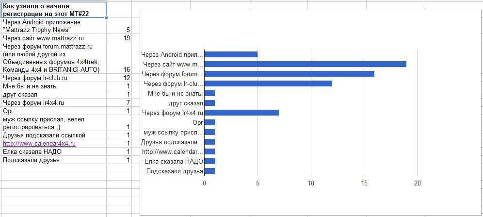 Эта статистика ваших ответов получилась не очень репрезентативная, так как одновременно совмещает в себе и историю тех, кто постоянно ездит на МТ и помнит, что изначально это была покатушка именно владельцев Land Rover, и тех, кто стал ездить на МТ недавно или вообще впервые о нем услышал. Тем не менее видно, что основным каналом распространения информации о Маттраззе было и остается простое человеческое общение (подсказали друзья), передача из уст в уста новостей и отзывов. Это в принципе отличает МТ от появляющихся покатушек новых клубов и даже коммерсантов, объявлениями о которых пестрит интернет. Это говорит о том, что МТ действительно не просто так себе покатушка, МТ имеет свою историю и свою аудиторию, и поэтому дух МТ передается от хороших людей только к хорошим людям. Конечно, исторически влияние форума LR-CLUB велико, хотя Маттразз и остается там "не клубным" мероприятием