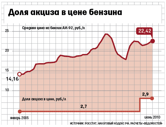 Акцизы на бензин в расчете на литр топлива будут повышаться на 1 руб. в 2011, 2012 и 2013 гг., решено на совещании у премьер-министра Владимира Путина вечером в воскресенье, сообщили «Ведомостям» сотрудник аппарата правительства и чиновник, знакомый с итогами совещания. Минфин предлагал повысить акциз на 2 руб. в 2011 г. и на 1 руб. в 2012 г., но, раз повышение будет более плавным, сохранится и транспортный налог, объясняет один из собеседников «Ведомостей».