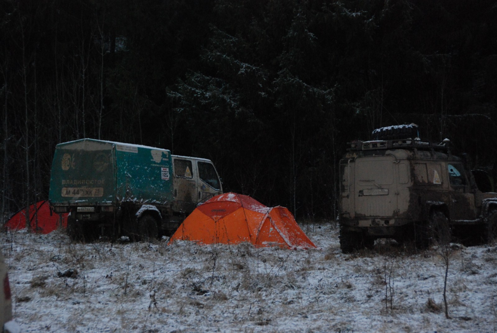 Ага, чуть-чуть поиграли в трамвайчик :) У Руссобалта будут фотки художественного распила крузака Кукурудзы бензопилой :) Но, правда, по скорости передвижения Кантеру в лесу за Крузаками не угнаться (зато Кантер проедет с головой и лебедкой везде, где проедут и они, но вот крузак бочку 200 л и прочего барахла под тонну не увезет :) ), и потому снова встретились с ними уже в лагере, хорошие ребята! :)