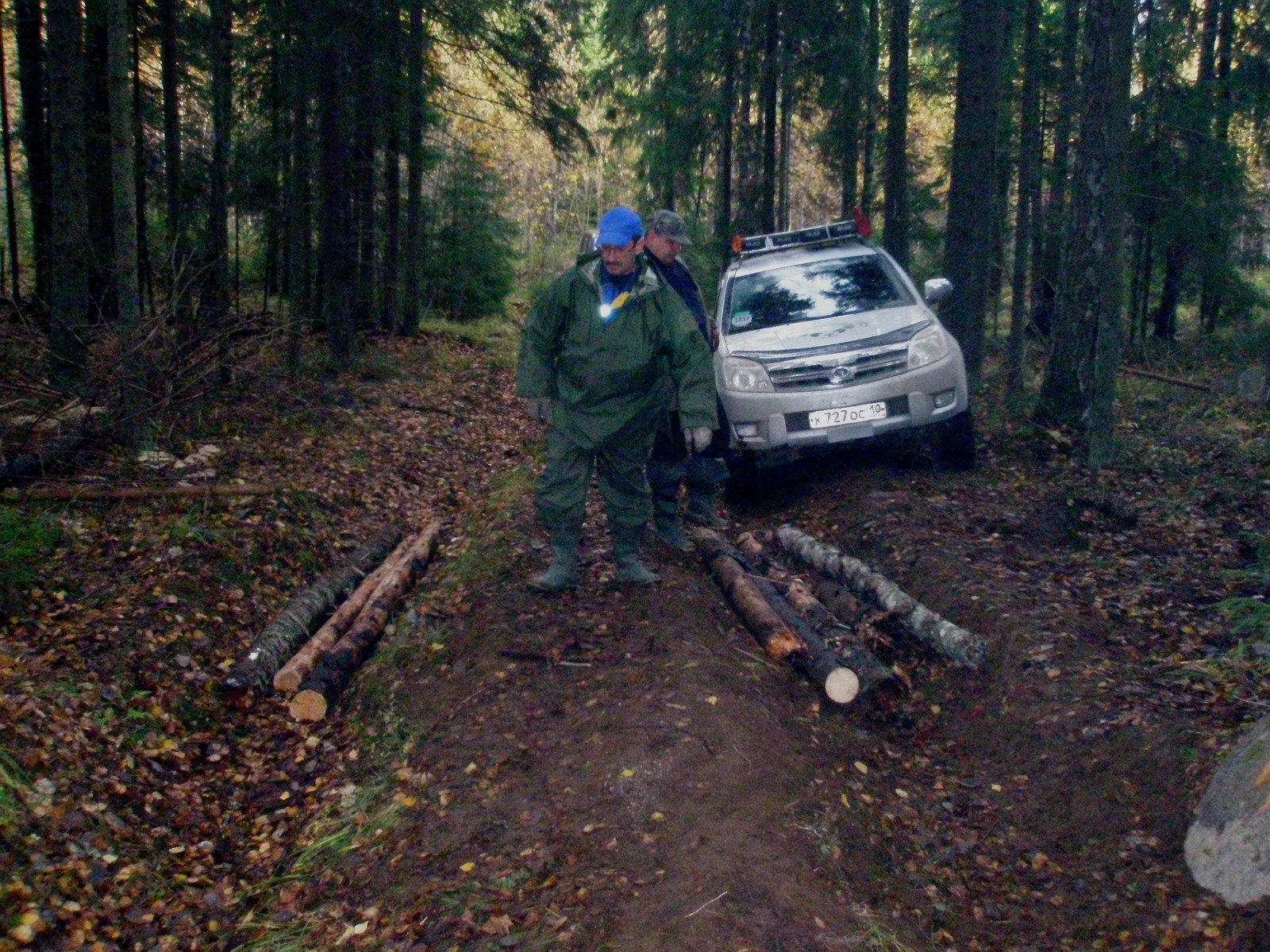Разчудесные дорожки приводили нас, то преодолевать болотину, размешанную зубастыми колёсами других участников, а то и пробираться сквозь пеньки и валежник к точкам спецучастков… Пилот справлялся с манёврами меж пеньков просто на 5 с +!!! Я и младший штурман старались во все глаза разглядеть наличие препятствий на пути Патриота. Не всегда, правда, удавалось выбрать правильную траекторию…Вот так на одном из участков, практически, с разбега машина застряла напрочь! Спасателями оказались: лопата, бензопила и наши шесть рук :wave: Уж, очень не хотелось спать в болоте, а потому просто обязаны были вылезти! И вылезли!