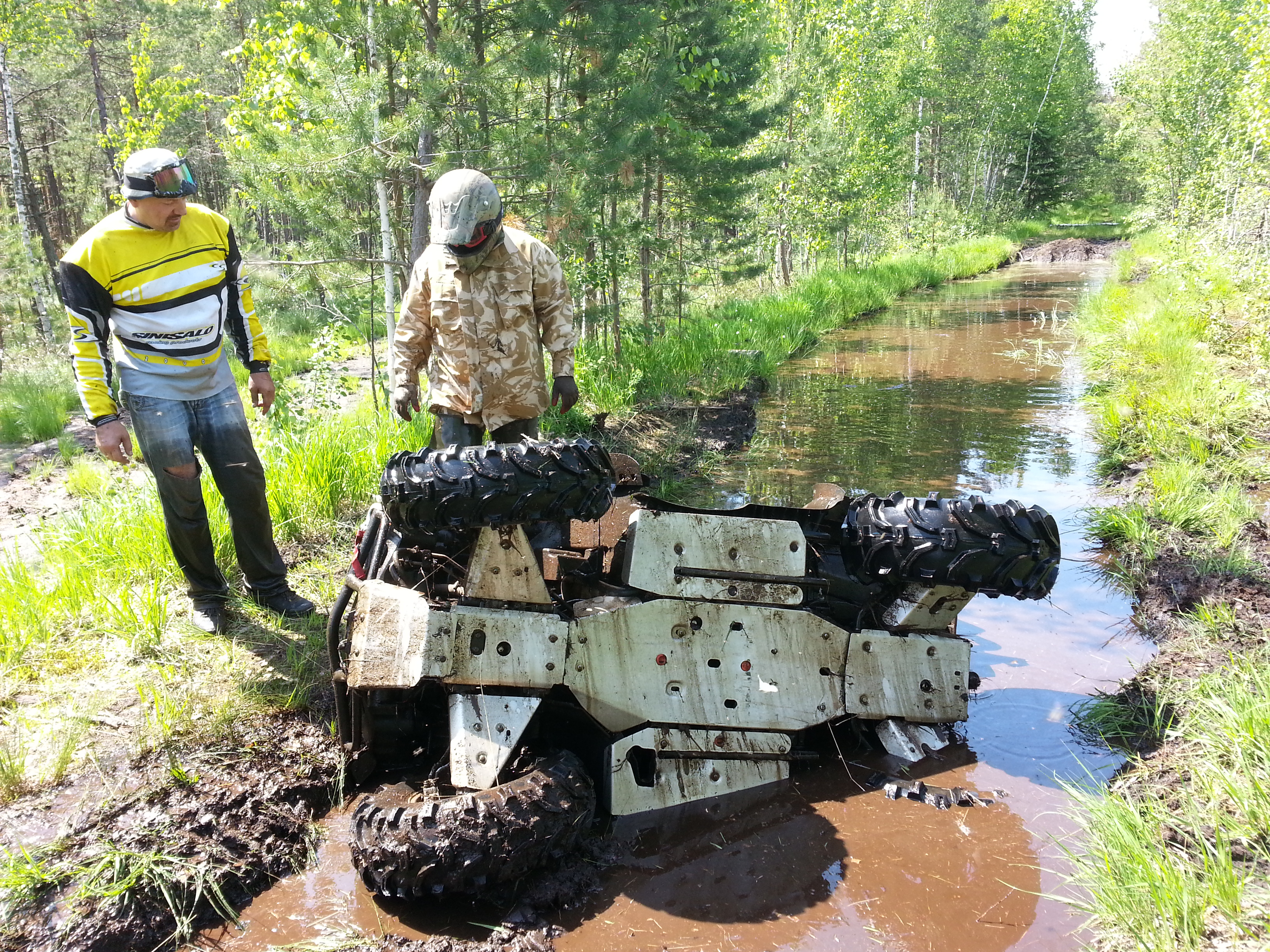 Первый раз проходили это место на трех квадрах весной. Намучились порядочно. В саму колею не полезли, после первых попыток стало ясно, что выгодней биться по обочинам, судя по следам эта мысль была не нова. Но обочины представляли из себя ковровое болото, поросшее лесом с одной стороны и просто болото без леса с другой. Кое как пробились на лебедке через лес. Место нам очень запомнилось, такой локальный адский участок даже для квадра.