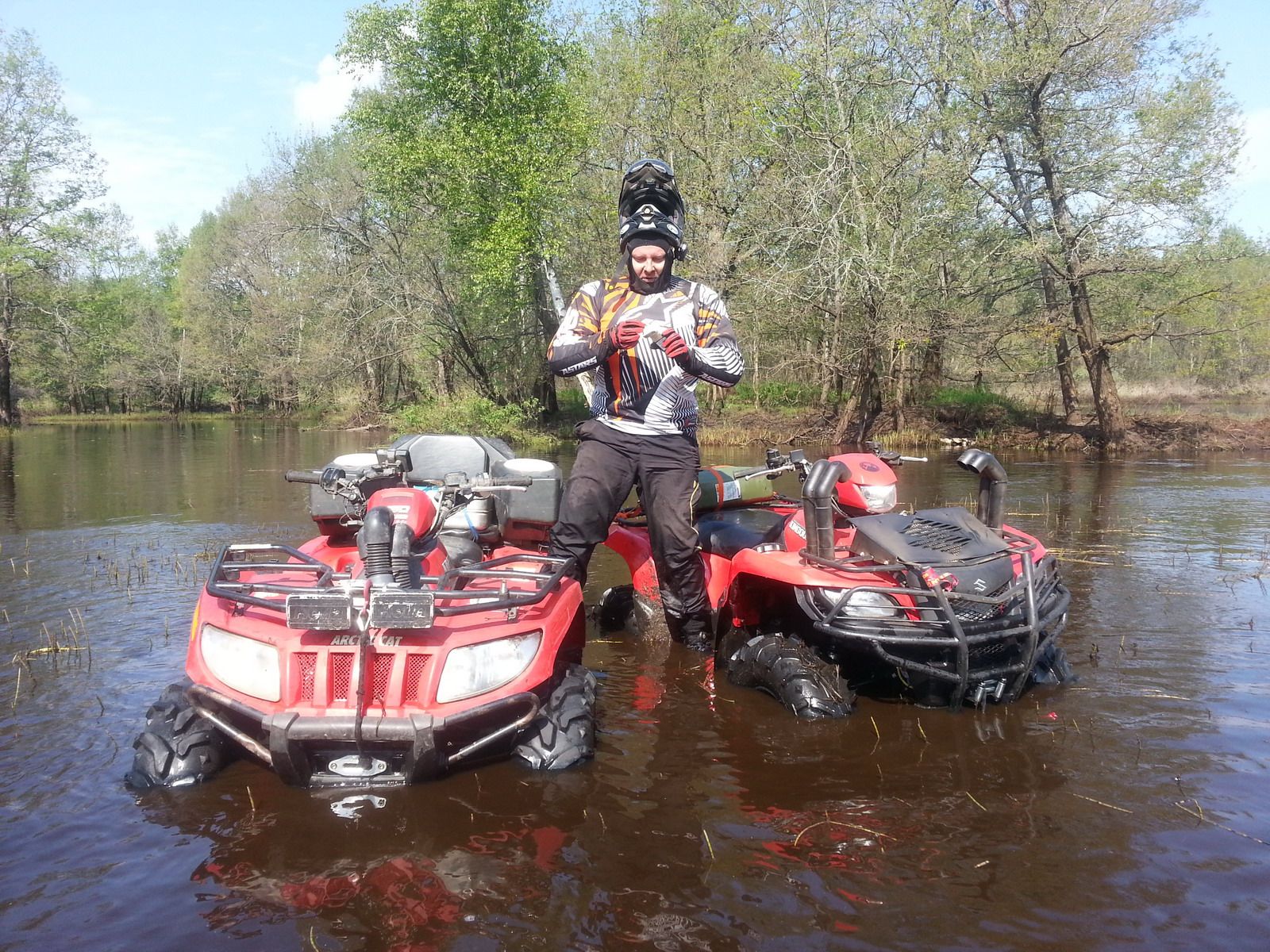 Второй раз был там три дня назад, в будни. Катался по Мещере в одно лицо и уже под вечер, для поднятия остроты ощущений решил этот участок пройти. На самом въезде в это место встретил охотников на уазе. Они выразили сомнение, что там можно на квадре проехать, про машины вообще не упоминалось, несмотря на приличную колею, уходящую в эту топь. После их слов сомнений куда ехать не оставалось. Немного напрягало то, что время было уже 6-7 вечера и скоро начнет темнеть, а я один, но положился на небесную канцелярию и свой набор для выживания.